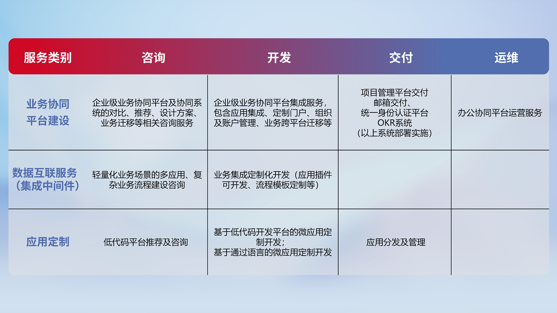 针对钉钉、、、、企微、、、IDaas等平台级产品提供产品的规划、、、、方案、、、交付、、、定制化开发等服务,,实现如统一协同办公、、、、智能客户服务、、、、混合会议管理、、智能数据查询、、、等业务场景,,,,实现数字化转型。。。